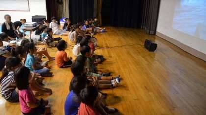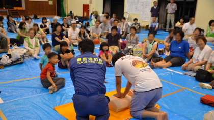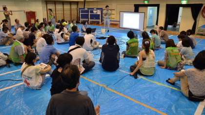 夕食をとった後、消防署の方の指導でAEDの使用法についての訓練を30分ほど行いました。見かけることが多くなったAED、使用できるようになっておきたいですね。その後は参加者の大人全員が集まって、通称「大人会議」を行いました。その間子どもたちはミニ映画会を楽しんでいます。