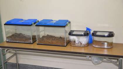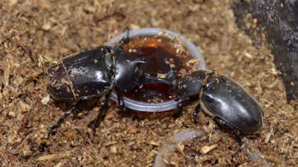 西昇降口で育てていたカブトムシが次々と羽化しています。大人のカブトムシは中央昇降口で飼育しています。見て下さいね。