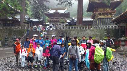 東照宮陽明門前で記念写真。幸いなことに雨が少し弱くなってきました。