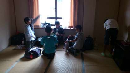 宿についてすぐに避難訓練を行い、大広間で部屋の使用上の注意などを聞いた後、部屋の整理などをしました。