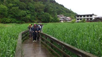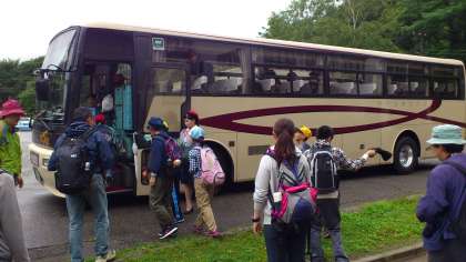 源泉を出発。バスで湯滝の上まで移動しました。いよいよハイキングのスタートです。雨もやみました。