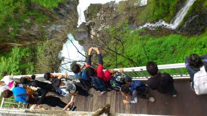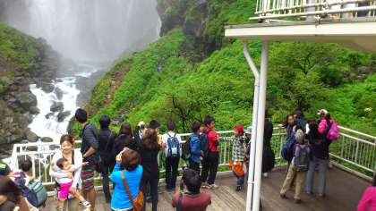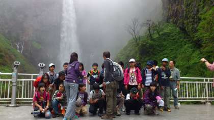 華厳の滝到着。記念撮影をした後、それぞれ見学。今日の滝は毎秒4トンの水量。いつもは2トンほどだということなので大迫力でした。