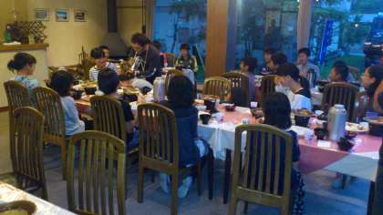 6時30分から夕食です。今日は、たくさん歩いたのでお腹がペコペコです。名物の湯葉も出て美味しくいただきました。