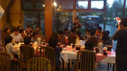 夕食時に、嬉しい演出が!担任の先生がトランペットをもって登場。8月生まれの子どもたちを、ハッピーバースデーの曲で祝福しました。みんな拍手喝采です。
