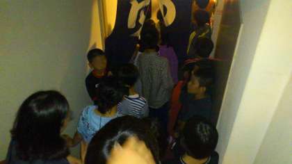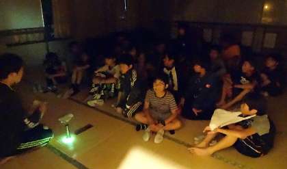 夕食の後は、本日の夜のお楽しみ「きもだめし」です。今夜は、パークロッジ深山さんの全面協力で、全館を使って行います。大広間に集まった子どもたちに怖い話を少しした後、今日のコースを実際にみんなでまわって説明しました。それだけでもちょっと涙目の子も・・・