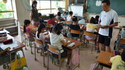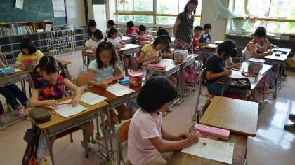 25日、夏の算数教室2日目。4年生のようすです。一生懸命まじめに問題に向き合っています。この学習に向かう姿勢がすばらしいですね。