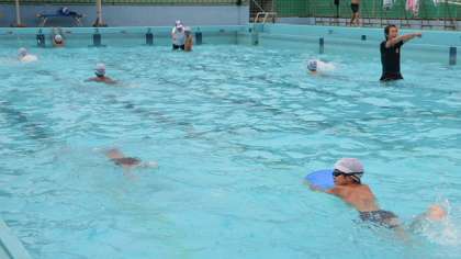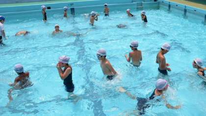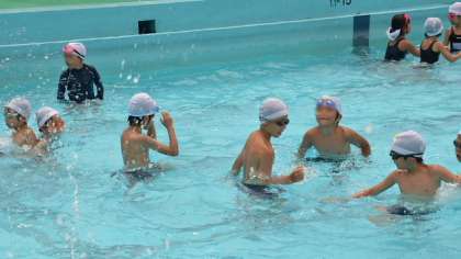 1・2年生の水泳教室のようすです。水に慣れ、水の中でリラックスできるようにすることが1・2年生には大事。いろいろな水遊びを通して水への恐怖心を取り除きます。といっても、一人一人の水泳の実力はだいぶちがいます。泳げる子にあわせたプログラムも実施します。