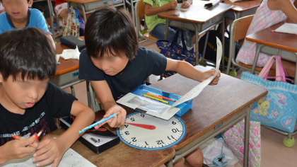 26日の夏休み算数教室は3日目。前半の最終日です。今日は本格的な夏の天気。熱い中をたくさんの子どもたちが参加しました。えらいですね。3年生は時計の読み方、時間の読み取り方の復習をしました。1学期の授業の時よりさらにくわしくていねいに学習できたので、みんなよくわかったという顔をしていました。