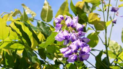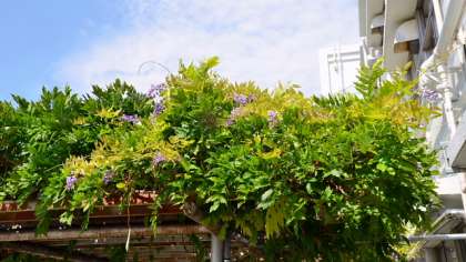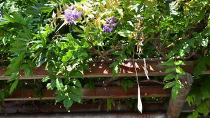 フジの花が一輪咲いたことを以前におしらせしましたが、職員室前のフジ棚に、なんと季節はずれのフジの花がたくさん咲いています。実がすでになっているところに咲いているフジの花。不思議な光景です。なぜ今頃咲いているのでしょうか?