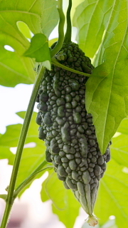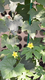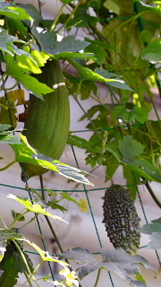 ゴーヤの生育がここのところの暑さで順調になり、ゴーヤの花が次々と咲き、ゴーヤの実もたくさんなり始めました。売っているゴーヤのようではありませんが、りっぱな実がなって、ヘチマとならんでいます。