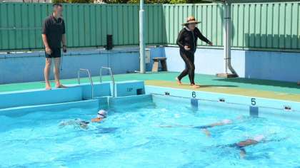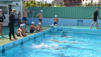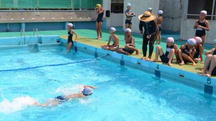 2日の夏休み水泳教室、5・6年生のようすです。今日は検定日、タイムの測定や、何m泳げるかを検定します。ひとつでも上の級をとろうとみんながんばっていました。