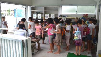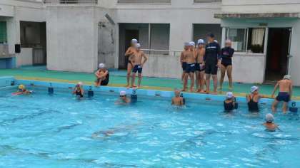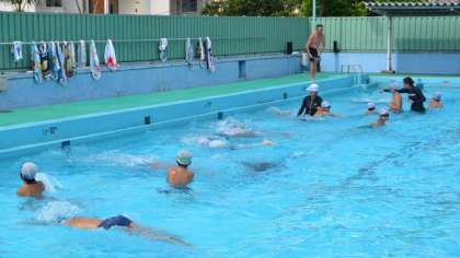 3日(金)、夏休みの水泳教室前期の最終日となりました。毎日のように通ってきた子は真っ黒に日焼けして健康的。がんばった証ですね。写真は5・6年練習のようすと、3・4年の受付のようすです。