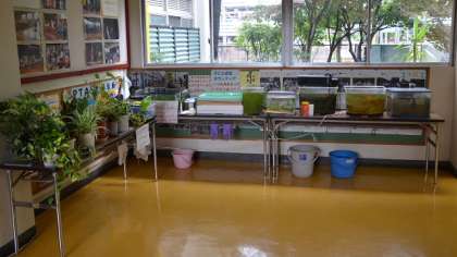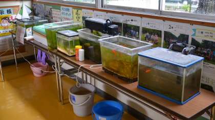 6日(月)、学校は完全に夏休みモードです。夏休み中、各教室で飼育栽培されていた生き物を全部、1階玄関脇に移して、日直の教員が面倒を見ています。学校に来たときはお子さんと一緒にのぞいてみて下さい。水の取り替えなど手伝ってもらえると助かるのですが。