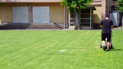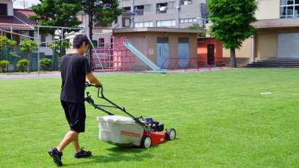 校庭の芝は8月1日に刈ったばかりですが、暑い日が続きぐんぐん伸びています。8日午前に2度目の芝刈りをしました。まばらになっていたところも、だいぶ根がはって、よい状態になっています。夏休み明けには状態のよく気持ちのよい芝でスタートできそうです。