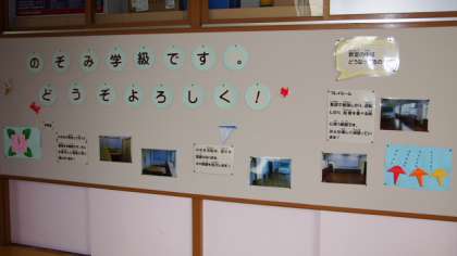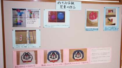 3階西側にある「のぞみ学級」の廊下掲示板のようすです。学級のようすや作業で作った作品例などが掲示してあります。