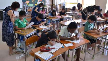 27日、今日から三日間「夏の算数教室」が行われます。写真は5・6年生のようすです。夏休みもあと少し。そろそろ「お休みモード」から切り替えるのに、算数教室への参加は最適ですね。みんなよく頑張っていました。明日もありますから今日よりも多くの子どもたちの参加を待っています。今日は学校図書館の開放もあり、12人の利用がありました。