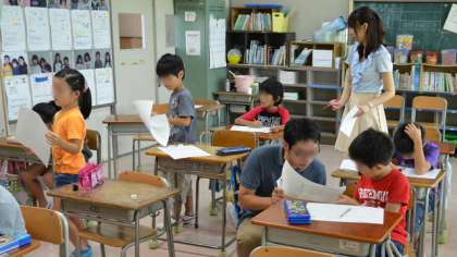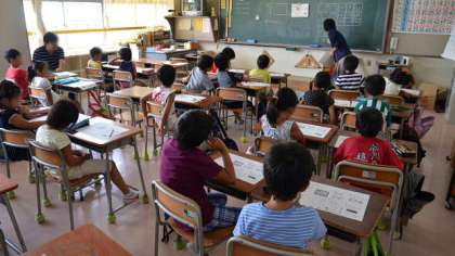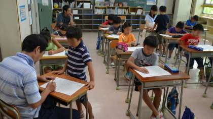 こちらは1・2年生の算数教室のようす。たくさんの子が参加しています。わからないところはていねいに指導します。