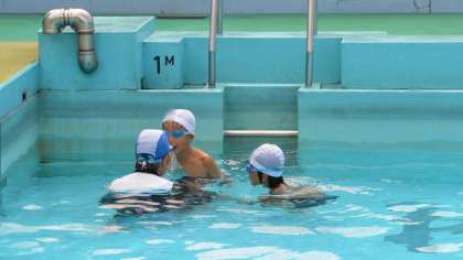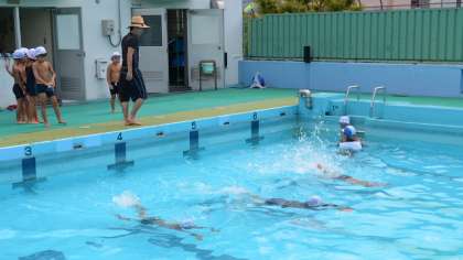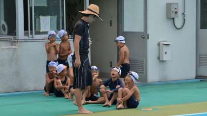 今日の水泳教室は検定日。水慣れと練習が終わって、さあいよいよ検定です。ひとつでも級をあげたくてみんながんばっています。級が上がった子は大喜び。でも残念な結果に終わった子もいます。それでも次のチャンスをめざして2学期も努力しましょう。