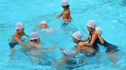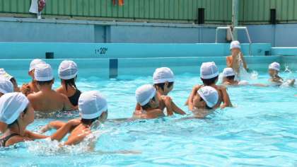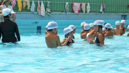 今年度初めてプールにはいった1年生もずいぶん水に慣れて、楽しそうに活動できるようになりました。写真は、ゲームを通して水に慣れ親しんでいる1・2年生のようすです。