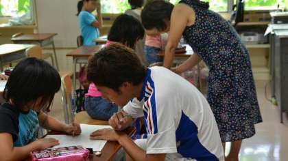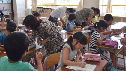 3・4年生のようすです。夏の算数教室は、一教室に3人の教員がついて指導できるのが効果的です。解けない問題は、粘り強く考えさせて指導しています。