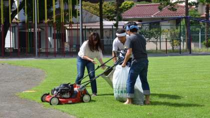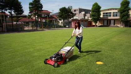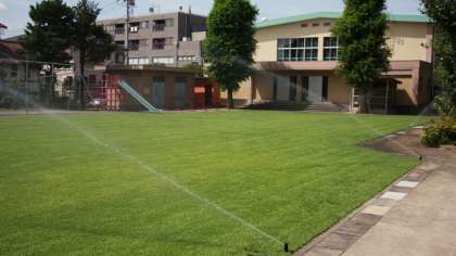 毎日天気がよいので、太陽の光をあびて芝生がよく伸びます。29日、2学期を前にしてこの夏休み期間中4回目の芝刈りをしました。2学期スタートにあたって、芝生のコンディションは上々です。