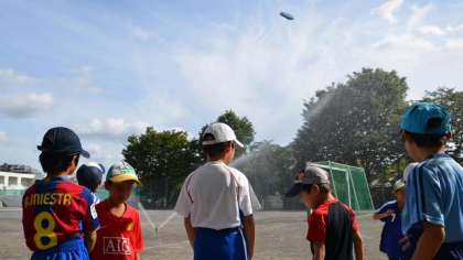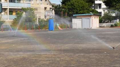 29日夕方、本校のサッカークラブが校庭に練習に来ました。校庭はカラカラであまりにも暑いので、少し散水することにしました。スプリンクラー作動中に上空には飛行船が、そして子どもたちが見つけたのは小さな虹です。