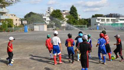 サッカークラブの練習前に散水