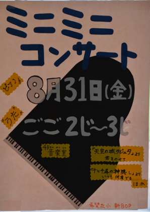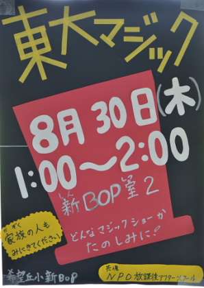 明日30日とあさって31日、希望丘小学校新BOPで上のポスターのように楽しい行事があります。夏休みの最後の思い出に、どうぞお出かけください。