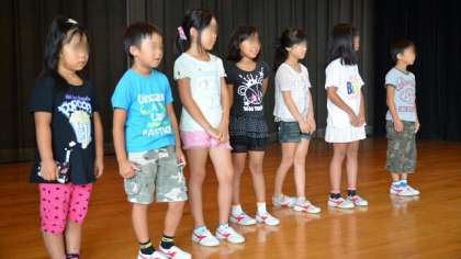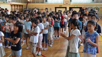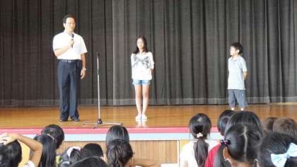 始業式に続いて3年生と5年生の転入生2名の紹介をしました。二人ともはきはきとあいさつができてすばらしいと思いました。最後は、夏休み水泳教室に休まず出席した7名の子を舞台上に呼び、みんなで大きな拍手をおくりました。今年の水泳教室は中止がまったくなかったので、全部出席した子は本当にすばらしいと思います。
