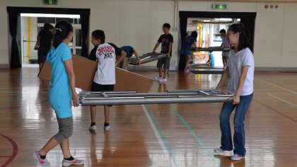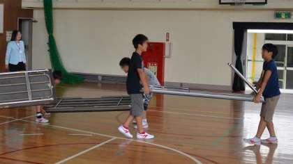 6年生が2学期1日目から、他の学年のために作業をしてくれました。夏休みの作品を各教室の廊下に飾るための、長机運びです。さすが最高学年、額に汗をかきながら一生懸命働きました。ありがとう。