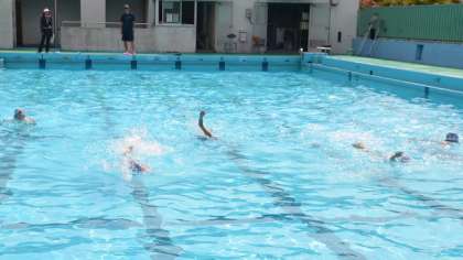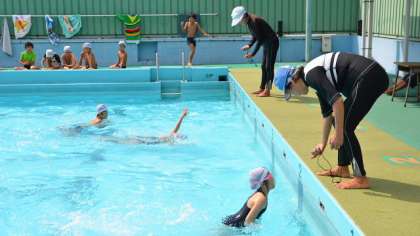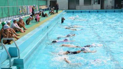 6日(木)、3・4年の水泳指導のようすです。今年度は天気がよい日が続いています。ほとんど水泳指導が中止になった日がありません。そのため、どの学年でも子どもたちの泳力が伸びています。今日の後半では、検定を行い、それぞれの努力の成果を見せ合い、がんばる子に声援がとんでいました。