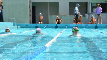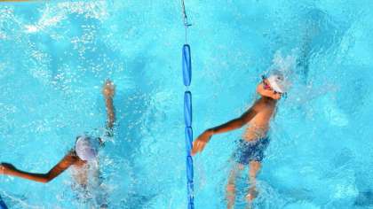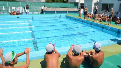 水泳記録会は区内64校のすべての小学校で行われています。タイムの上位者は区で集計して順位が出ます。種目は個人種目として25m,50m、100mの自由形、平泳ぎ、背泳ぎが、リレでーは50m×4人と25m×8人があります。各自が自分で選んだ種目にエントリーして、タイムを競いました。スタート位置について名前を呼ばれると、みんなから声援がとびます。さあスタートです。水しぶきをあげての力泳です。