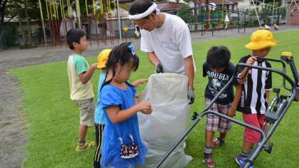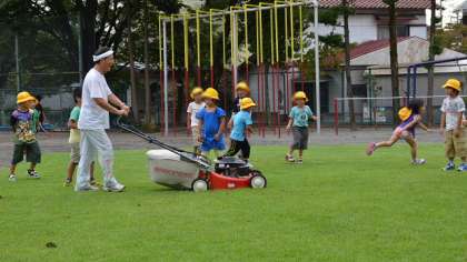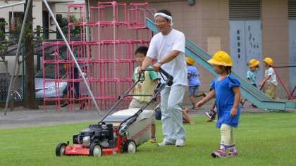 校庭の芝がだいぶ伸びてきたので、新学期が始まって初めての芝刈りをしました。給食時間から始めたのですが途中で昼休みになって子どもたちが出てきて、芝刈り機に興味津々。特に1年生がおもしろがっていました。刈った芝生の上では子どもたちがコロコロ転がって遊んでいました。