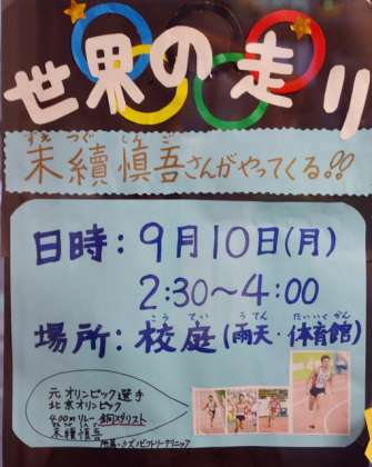 新BOPだよりでもすでにお知らせしていますが、明日10日(月)、北京五輪の陸上400メートルリレー銅メダリスト、末續慎吾さんと4人のコーチの方が来校して、子どもたちに走り方を教えてくださいます。開催時刻は午後2時30分から4時までで、場所は校庭(雨天時は体育館)です。参加希望者は直接会場に集まってください。