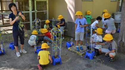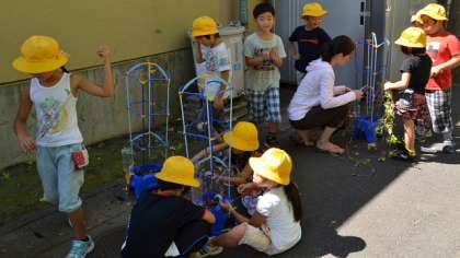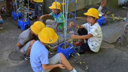 10日、2時間目。1年生が1学期から育てていたアサガオのツルを植木鉢からはずす作業をしました。一人ではなかなか難しいので、友達と共同作業ではずします。取り外したツルは、リースづくりに使います。