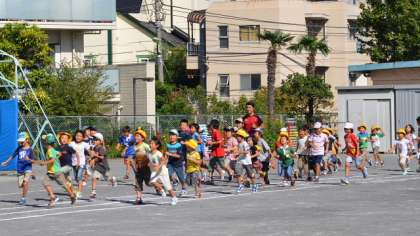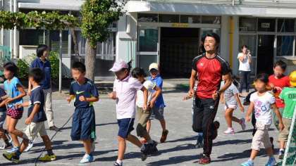 10日放課後、新BOPの行事で、なんと北京オリンピック陸上競技男子100m×4リレーの銅メダリスト末續さんが来校して、子どもたちに走り方の手ほどきをしてくださいました。最初は校庭を一周してウォーミングアップ。末續さんをかこんで子どもたちは張り切って走りました。