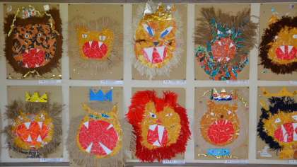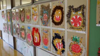 図工室前はいつでもミニ展覧会です。今は、3年生の個性あふれる「王様ライオン」と、4年生の実用的に使える「カレー皿(陶芸)」が展示してあります。来校の際に、東校舎二階にお立ち寄りください。
