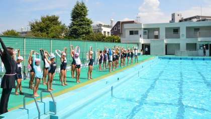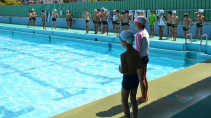 締めくくりのプール納めのセレモニー。3・4年の代表が、今シーズンの成果と、来年への抱負をマイクを使わずにしっかりした口調で話しました。終わりに今シーズン事故もなく楽しく授業できたプールにむかって、そして指導してくださった指導員さんへの感謝の気持ちをこめて、みんなで元気よく、「ありがとうございました」のあいさつをしました。
