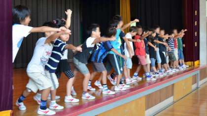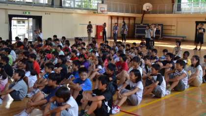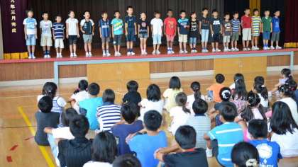 14日(金)朝、体育館で2年生の発表集会を行いました。始めは群読です。北原白秋の詩「まつり」を元気よく群読しました。みんなで役割を分担して「わっしょいわっしょい」と威勢のよいお祭りの雰囲気を出しました。これには会場の子どもたちもわくわくして、みんなの顔にも笑みがうかびました。