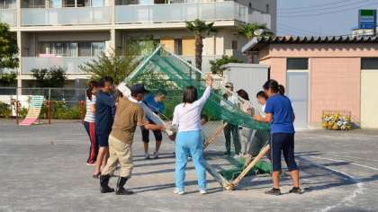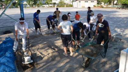 少し前の話題です。13日(木)の放課後、1・2年生の保護者会があった日ですが、運動会に備えてサッカーゴールの移動をしたり、ライン引きをしたりと職員総出で作業をしました。さらに、走り幅跳び用の砂場の砂に土が流れ込んで固くなっていたため、固くなった土を掘り出しました。(翌日新しい砂をいれました)このように、業者に頼らず、少しでも経費を浮かすためみんなで頑張っています。