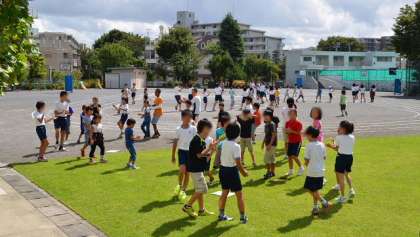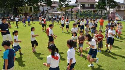 18日中休み、芝生の上で希望っ子班ごとに、運動会全校ダンスの「ジンギスカン」の練習をしました。各学年が入り交じって楽しいひとときです。本番では、保護者の皆さんにも参加していただきますのでよろしくお願いします。