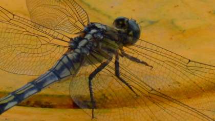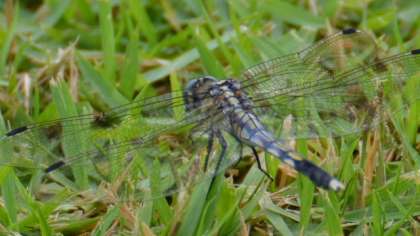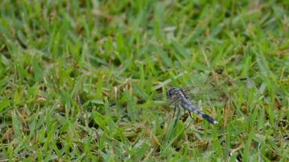 19日、朝から雨が降ったりやんだりで、校庭を使った運動会の練習は予定変更して体育館で行いました。雨がやんだ校庭にふと目をやると、たくさんのトンボが芝生の上を飛んでいました。ほとんどはアキアカネのようです、中でも大きめのものが・・・シオカラトンボです。そばによって写真を撮りました。拡大するとけっこう迫力がありますね。