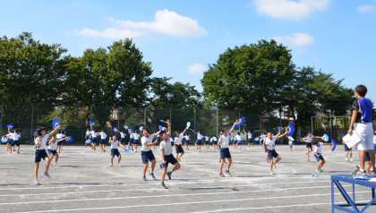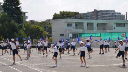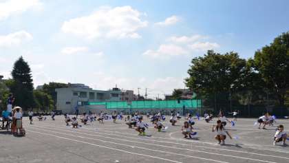 20日、昨日とは一転して夏が戻ってきたような天気になりました。満を持して各学年が表現種目の練習を校庭で行いました。1・2時間目は5・6年生です。毎年恒例の「みかぐら」に取り組みます。いくつものパターンがあり覚えるのも大変、そしてしっかり腰を落としてかっこよく踊るのも大変です。一生懸命踊るとくたくたになります。それでも、みんなが真剣に引き締まった表情で踊っています。