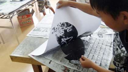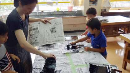 21日、2年生の図工のようです。最近は運動会の練習についての記事ばかり載せていますが、しっかりと通常の授業もしています。紙版画を製作していました。インクを使うので専科担任も大奮闘です。子どもたちのとても楽しそうな表情がいいですね。刷り上がりをドキドキしながらのぞき込む姿も版画ならではの楽しみですね。