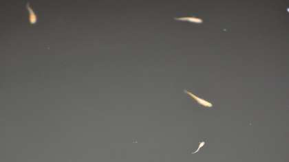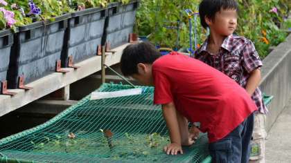 休み時間に池をのぞき込む子。大きいメダカに混じって小さいメダカの姿がたくさん。興味津々です。今年度初めに池に放したメダカの数は50匹あまりでしたが・・・今は何百匹というようすです。