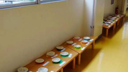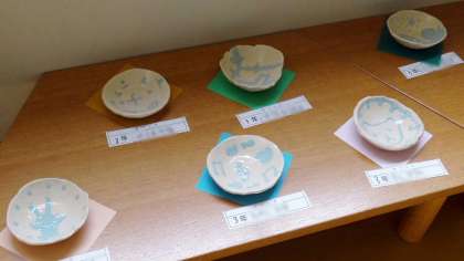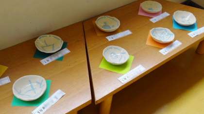 もう一つ図工室前に展示してある作品を紹介します。3年生の陶芸作品が展示してあります。粘土をこねて器の形をつくりました。一度焼いた後、絵付けをして釉薬をかけてもう一度焼いた本格的で実用にも使える作品です。展示後に持ち帰ったらぜひ使ってみてください。