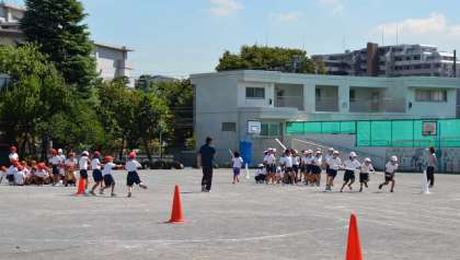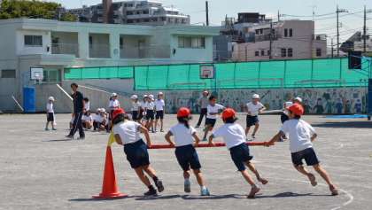24日、昨日の雨から天気が回復し、今日も運動会練習をがんばっています。3・4年団体種目の練習のようすです。3・4年生の元気さがはじけます。