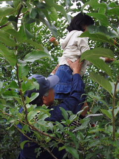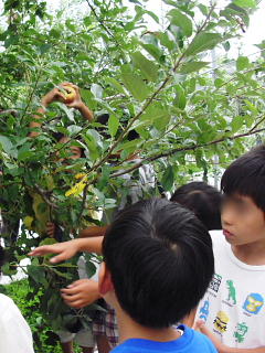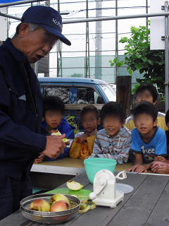 運動会の練習で大忙しの子どもたちですが、そんな中、3年生は近所のリンゴ園へリンゴ狩りに出かけました。リンゴ園には、年間を通して生活科の学習で農業について学ぶため出かけて体験学習していますが、今日は楽しいリンゴの収穫とあって子どもたちは大喜びです。最初に試食もさせていただいて、意欲満々。リンゴ園の方に、リンゴのもぎ方を教えてもらって、さあ収獲です。
