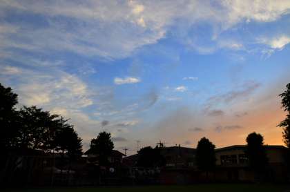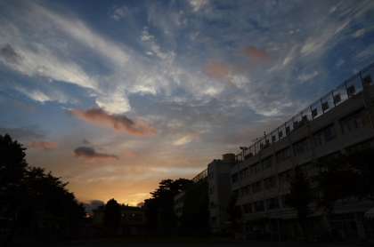 25日の日没直後、西の空です。高いところの雲はもう秋の雲ですね。夕焼けも出て、明日の天気は大丈夫でしょうか。南から台風が近づいてきていて、29日運動会当日の予報は曇りマークですが、天気の行方が心配です。