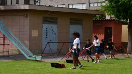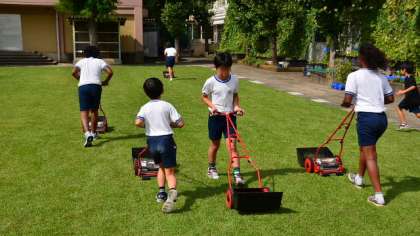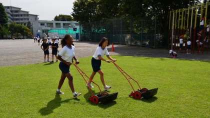 26日(水)、今年度発足した児童会エコ委員会が芝刈りをする日になっています。今日は天気に恵まれ、中休みに委員会の子どもたちが手動の芝刈り機で頑張ってくれました。それを見ていた低学年の子どもたちが興味津々。やってみたいという子どもたちにお兄さんお姉さんらしさを発揮して、一緒に芝刈りをしている姿がほほえましく感じました。中休みが終わって子どもたちに感想を聞いてみたところ「エコ委員会になってよかった。やりがいがあります。」という応え。働き者の希望っ子たちです。おかげで、運動会当日はすばらしいコンディションの芝生で皆様をお待ちしています。昼食時間に是非ご利用下さい。